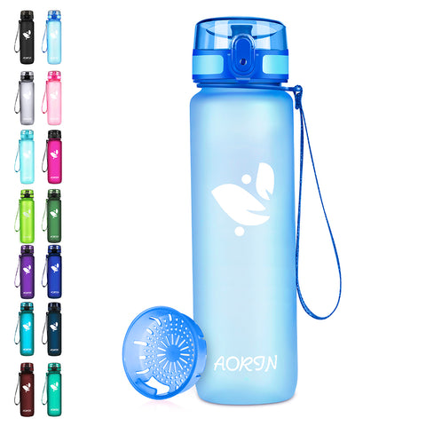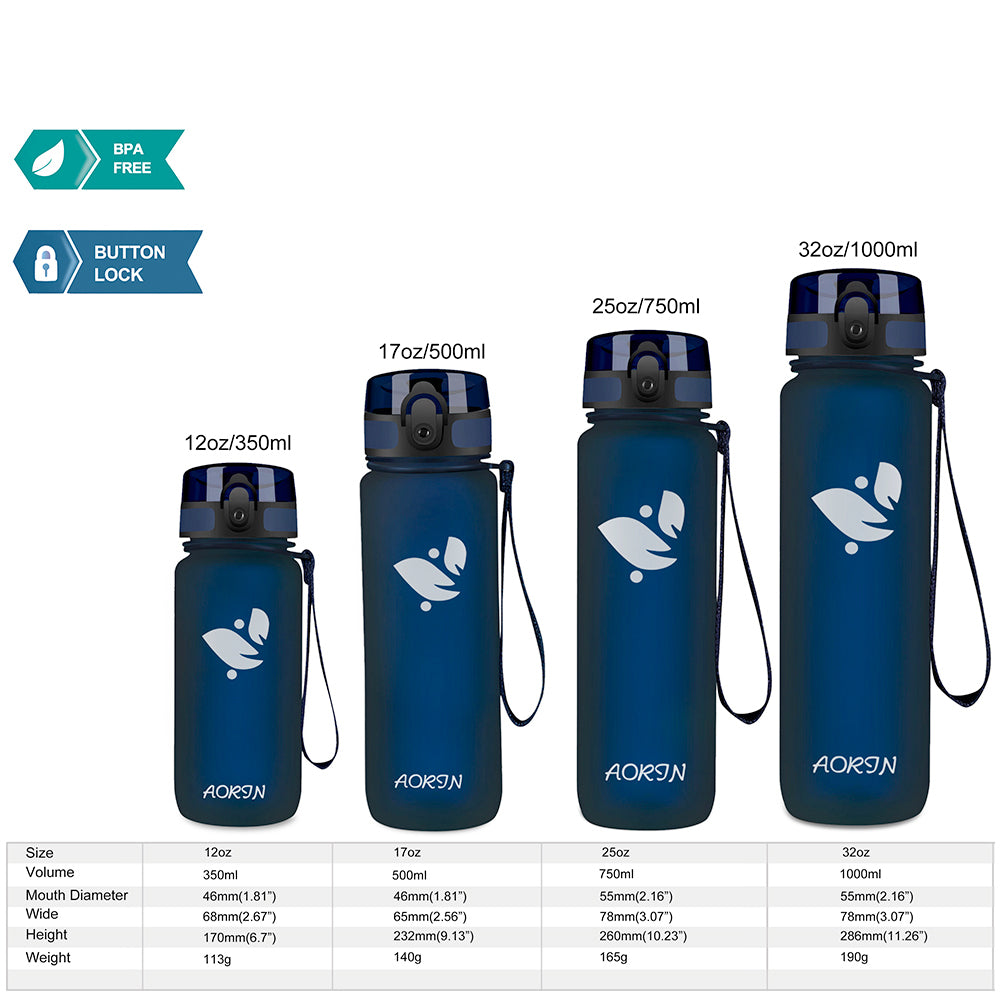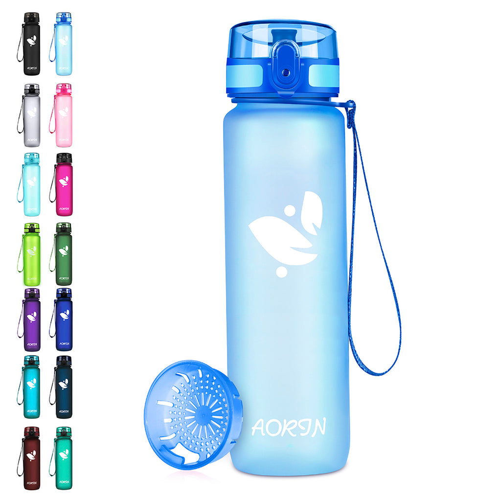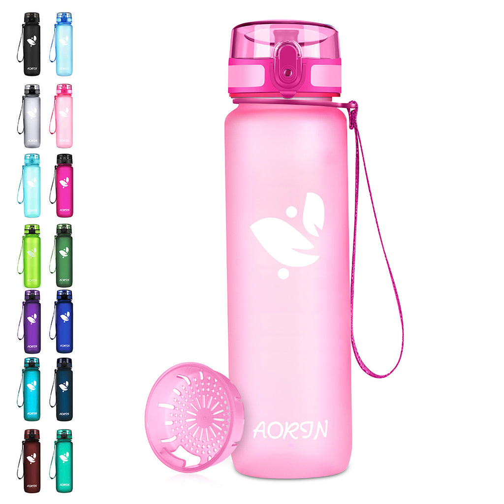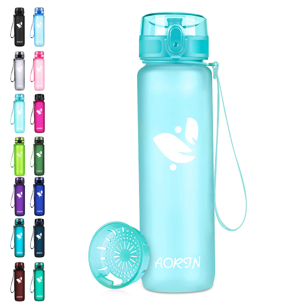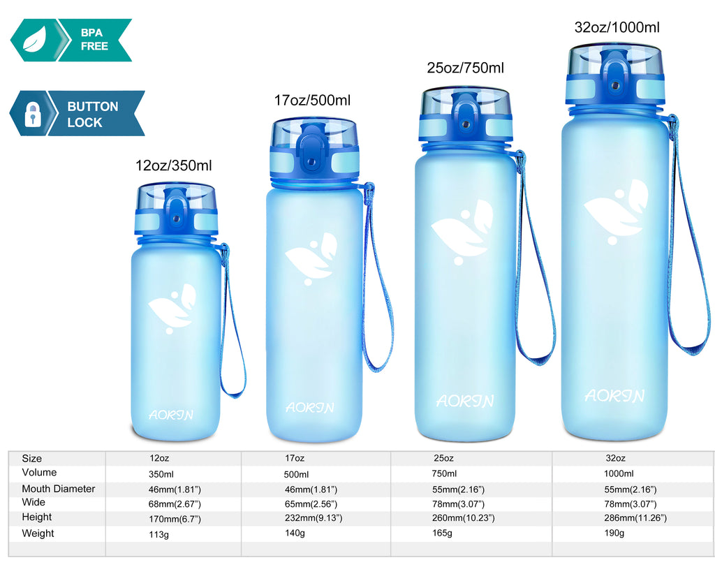 EASY TO USE AND VIEW :One hand push the button & the lid pops open to have a quick drink,(Open with just one click).AORIN drinking bottles comes with a removable filter that comes in and out on the top.And it also has a wide mouth to adding ice cubes and making cleaning that much easier. There are measurement scales on the side, 100ml-1000ml, easy to use.
